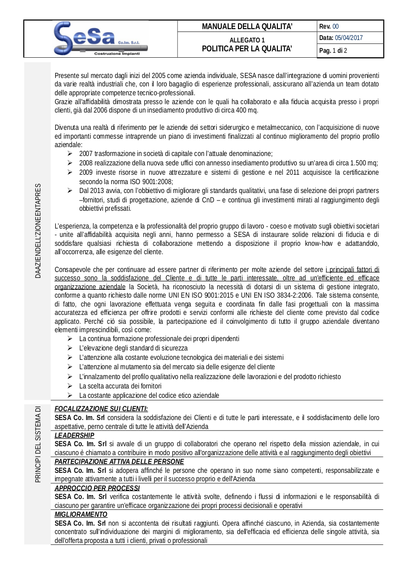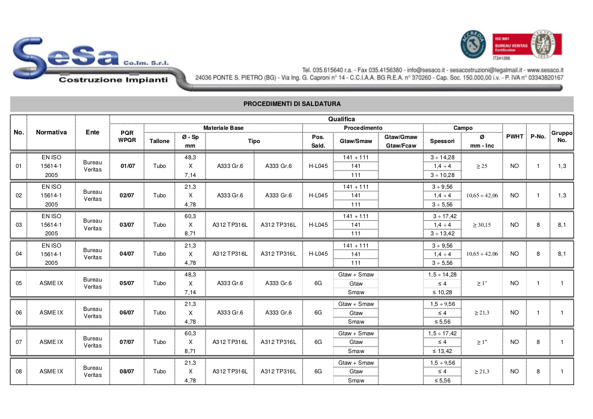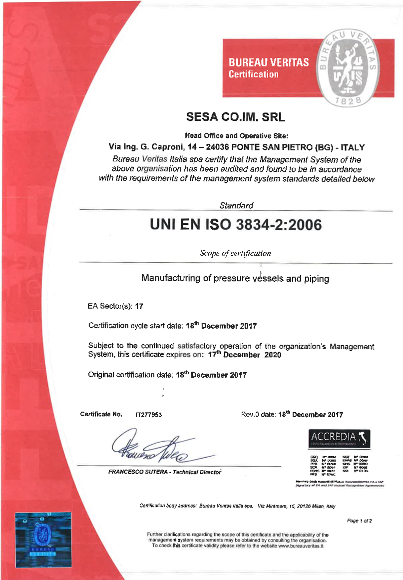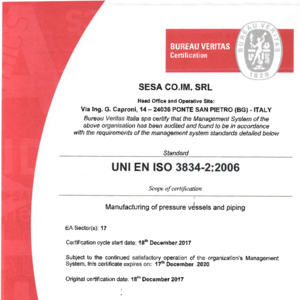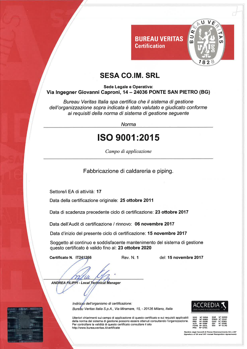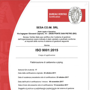 Tutti i processi lavorativi sono controllati attraverso il sistema di gestione della qualità certificato secondo la norma EN ISO 9001:2015 e EN ISO 3834-2:2006 che permettono di garantire ai nostri clienti prestazioni di altà qualità, sempre ottimali ed affidabili.